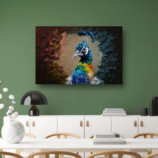 Dynamische kleurrijke pauw in abstracte stijl canvas met baklijst