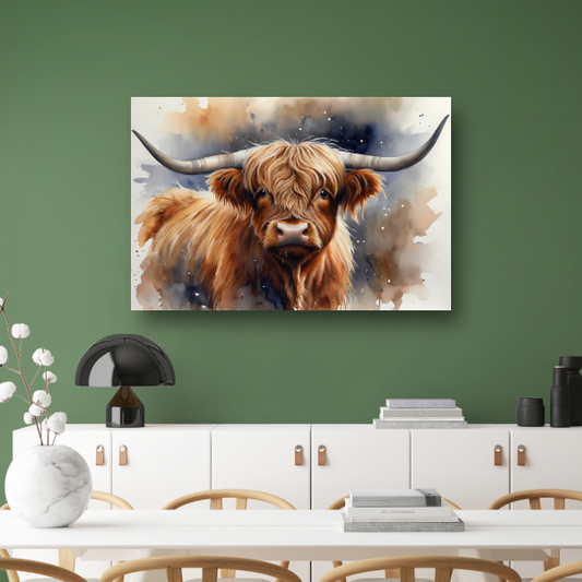 Highland koe portret met waterverf canvas met baklijst