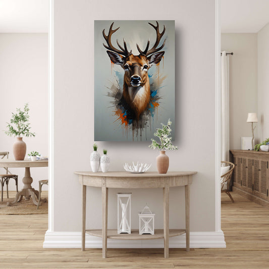 Expressief Hertenportret met Kleurrijke Spatten canvas met baklijst