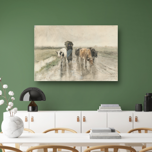 Een boerin met koeien op een landweg in de regen - Anton Mauve canvas met baklijst