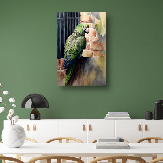 Waakzame Papegaai tegen Rustieke Achtergrond canvas met baklijst