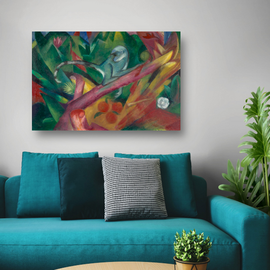 Abstracte Aap met Turquoise en Zilver Verf canvas met baklijst