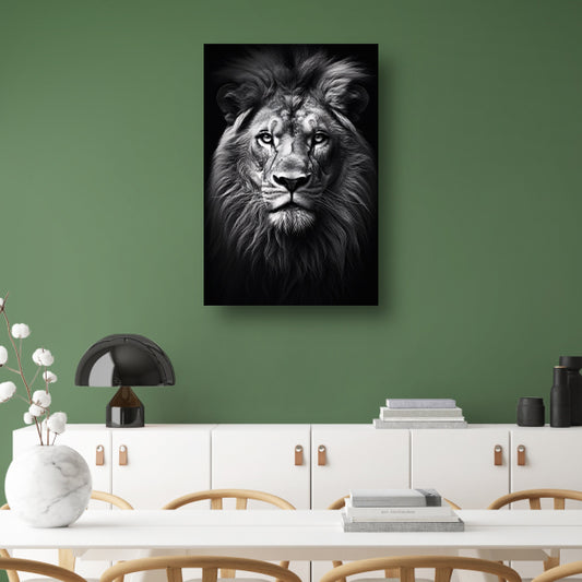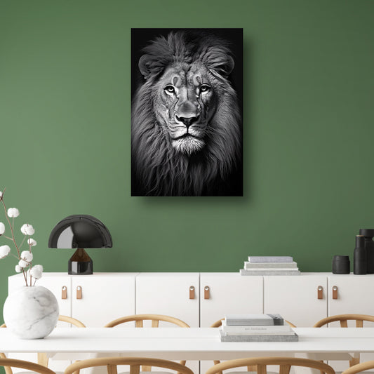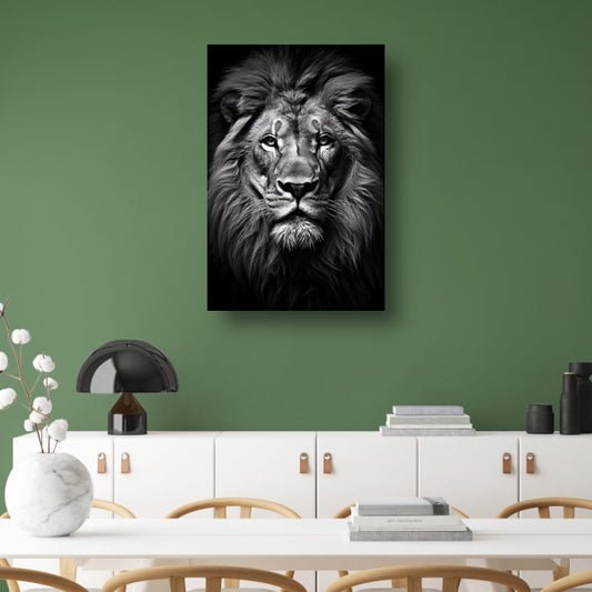 Koning der Dieren: Zwarte en Witte Leeuw canvas met baklijst