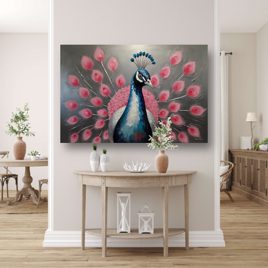 Pauw met roze bloemen in moderne stijl canvas met baklijst