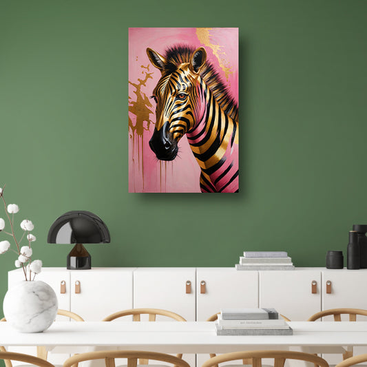 Gouden Zebra met Roze Achtergrond Kunstwerk canvas met baklijst