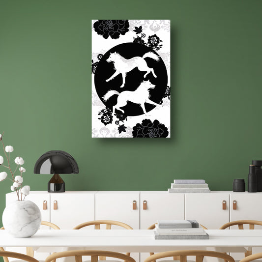 Zwart-wit silhouet van dansende wolven en bloemen poster