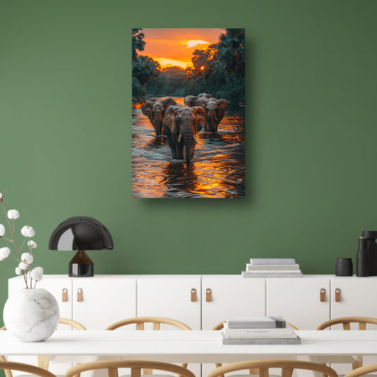 Olifantenfamilie steekt rivier over bij zonsondergang poster