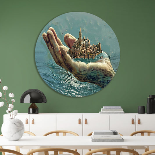 Stad gedragen door een gigantische hand aluminium muurcirkel