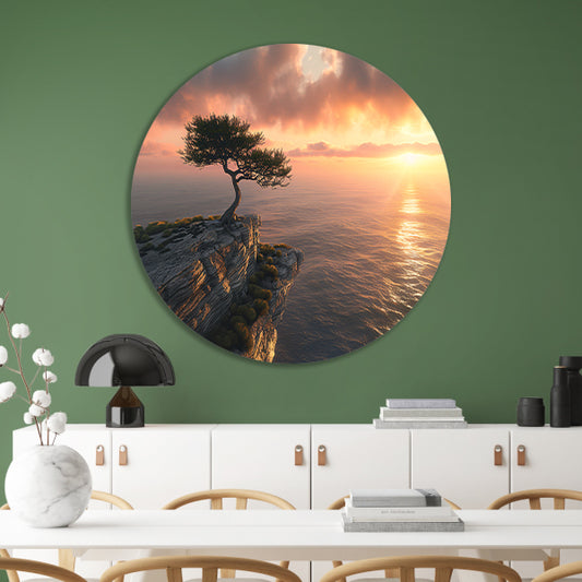 Boom op klif met zonsondergang zee aluminium muurcirkel