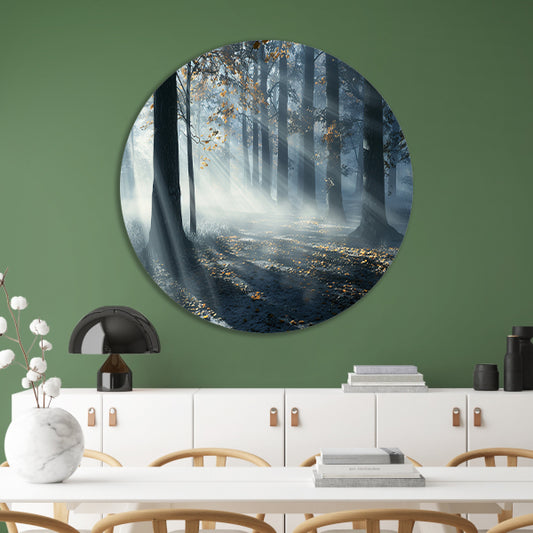 Mistig Bos met Zonnestralen en Schaduwen aluminium muurcirkel