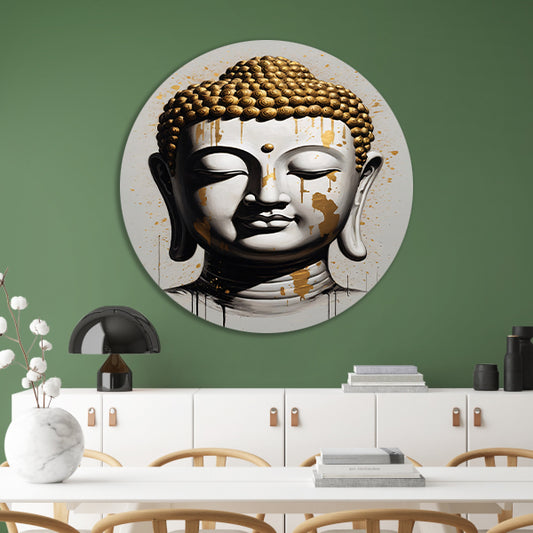 Boeddha Hoofd met Gouden Druppels Modern Kunstwerk aluminium muurcirkel