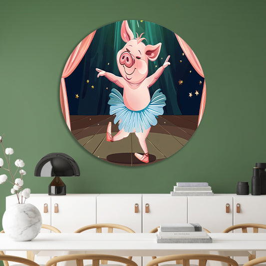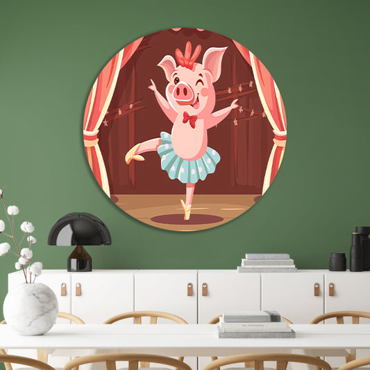 Vrolijk dansend varken in tutu op podium aluminium muurcirkel