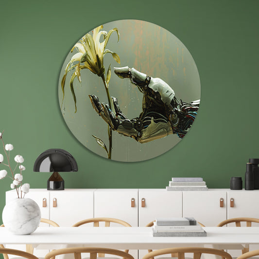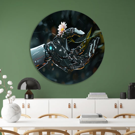 Robotische hand houdt delicate bloem vast aluminium muurcirkel