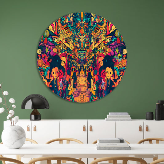 Kleurrijke fantasie markt in levendige kleuren aluminium muurcirkel