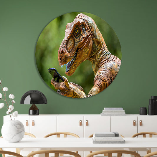 Dinosaur met smartphone in futuristische wereld aluminium muurcirkel