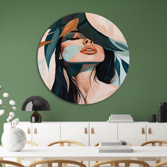 Modern portret van elegante vrouw met bladeren aluminium muurcirkel