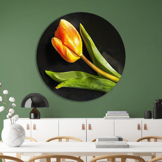 Gele tulp met waterdruppels op zwart aluminium muurcirkel