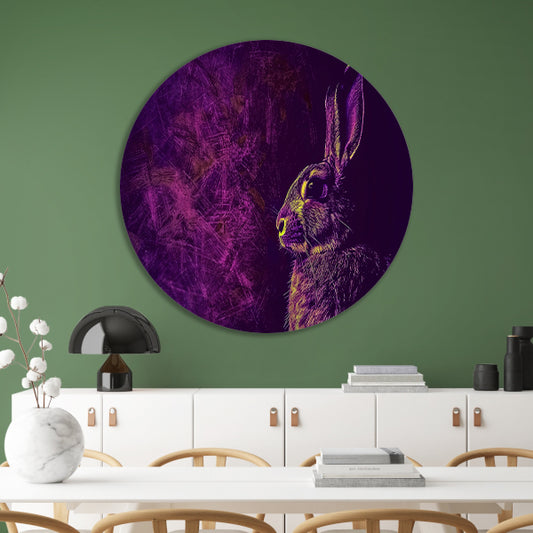 Digitaal konijn in paarse en gele tinten aluminium muurcirkel