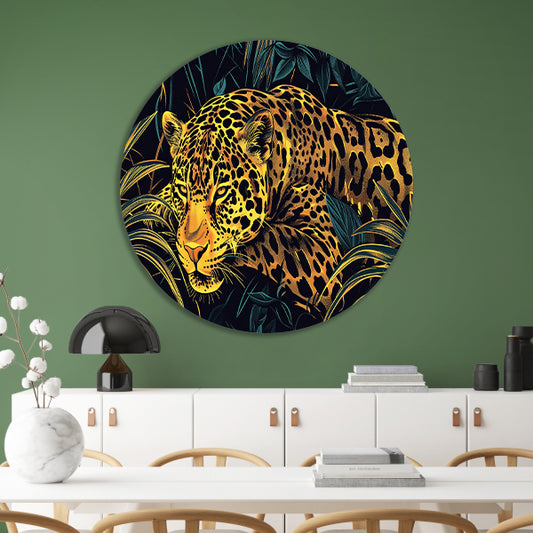 Gedetailleerde lijntekening van een jaguar in jungle aluminium muurcirkel