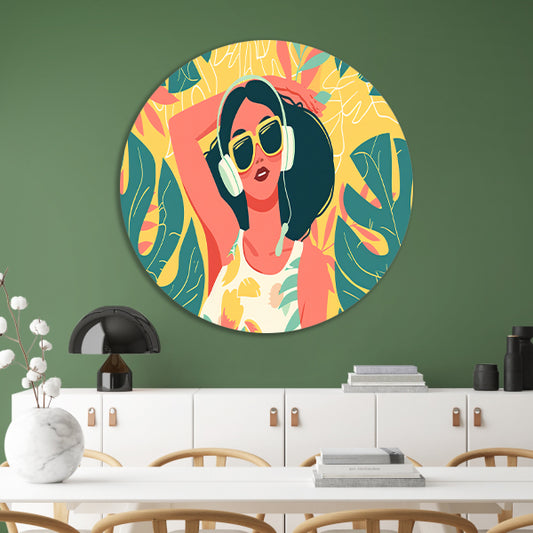 Kleurrijke vrouw met koptelefoon in relaxmodus aluminium muurcirkel