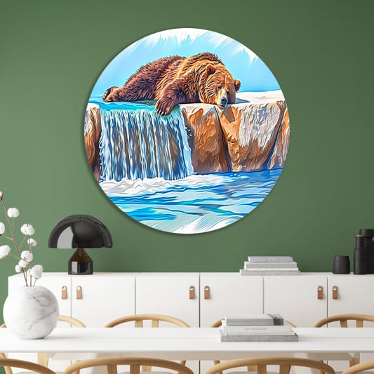 Beer rustend op waterval in natuur aluminium muurcirkel