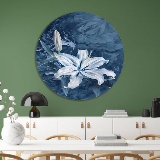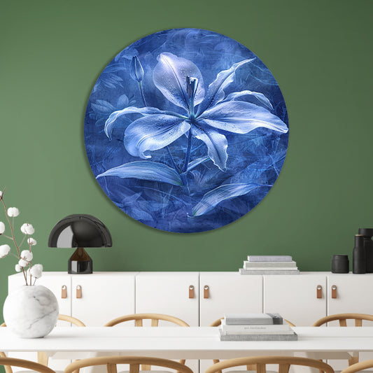 Gedetailleerde digitale lelie in blauw-wit aluminium muurcirkel