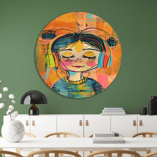 Vrolijk Meisje Luistert naar Muziek aluminium muurcirkel