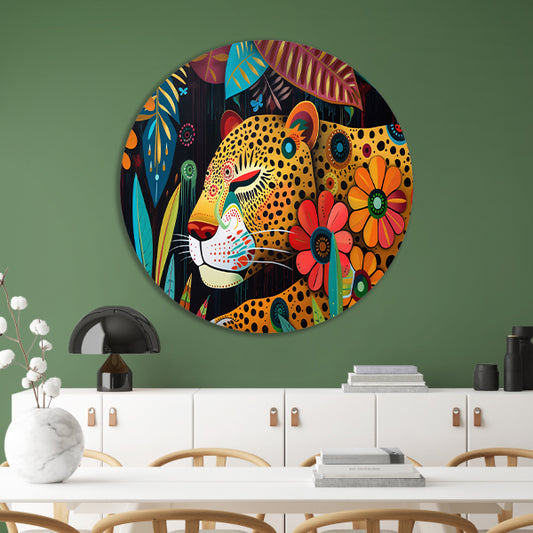Kleurrijk schilderij van luipaard en bloemen aluminium muurcirkel