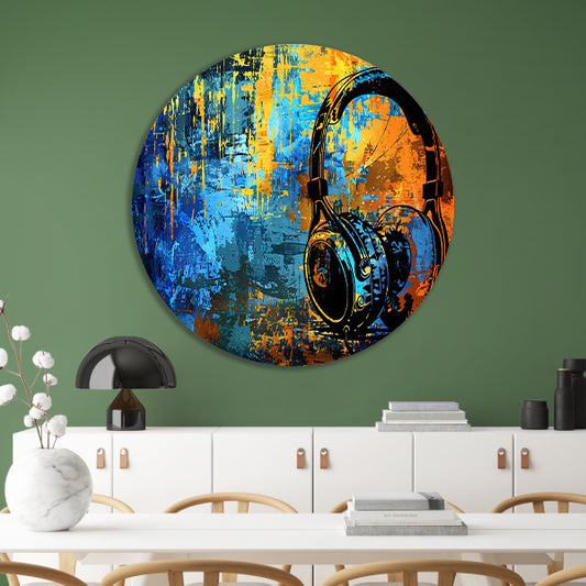 Kleurrijke koptelefoon met abstracte achtergrond aluminium muurcirkel