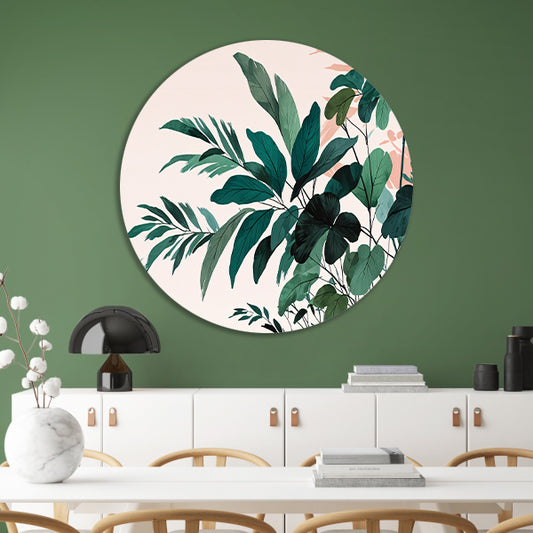 Japandi stijl botanisch kunstwerk met bladeren aluminium muurcirkel
