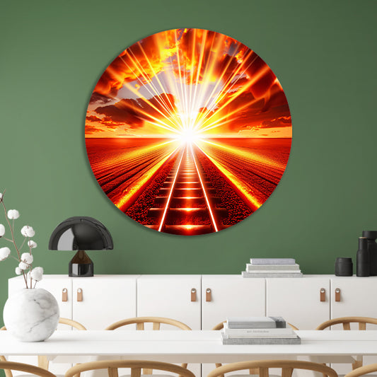 Spoorweg naar vurige zonsondergang aluminium muurcirkel