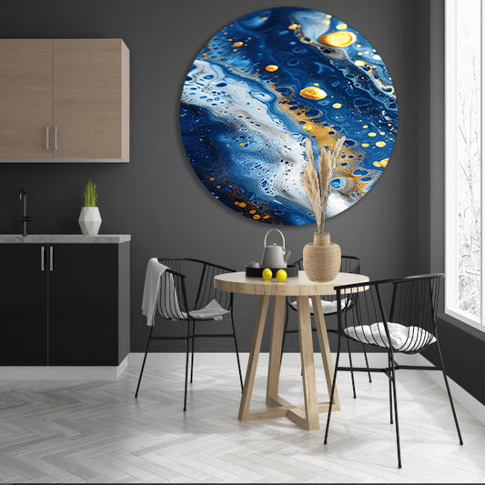 Abstract schilderij met blauwe en gouden tinten aluminium muurcirkel