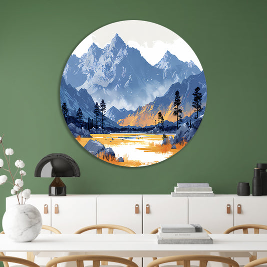 Zonsondergang bij Bergmeer in Blauwtonen aluminium muurcirkel
