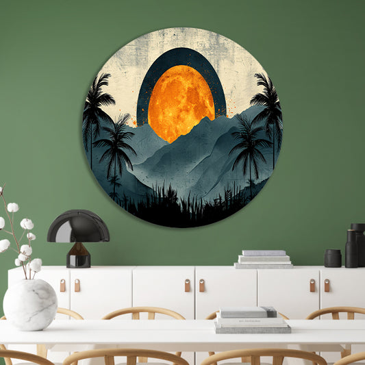 Zonsondergang tussen palmen en bergen aluminium muurcirkel