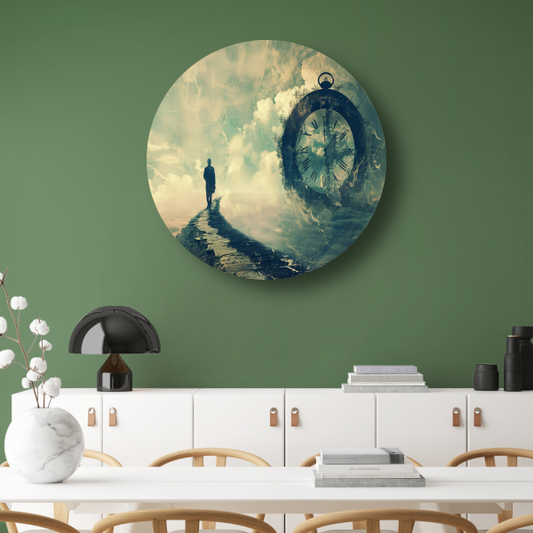 Wandelaar op een surrealistische tijdbrug aluminium muurcirkel