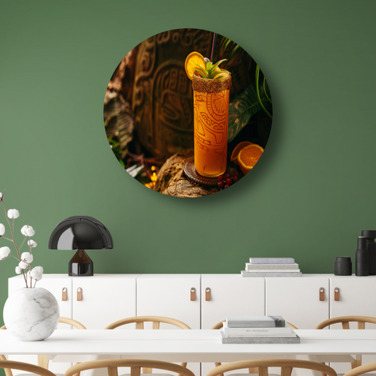Glas sinaasappelsap op rots aluminium muurcirkel