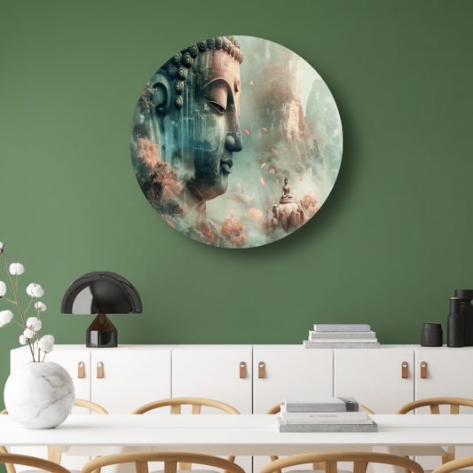Mystieke Boeddha en Herfstachtig Berglandschap aluminium muurcirkel