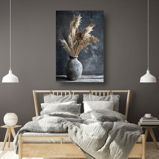 Blauwe vaas met roomkleurig pampasgras tegen donkere achtergrond acrylglas