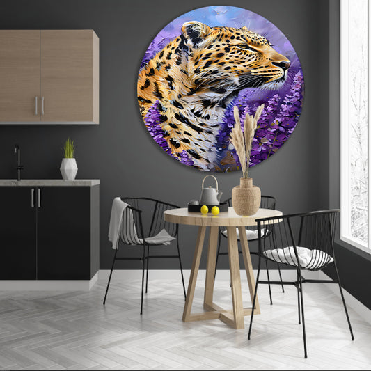 Realistisch luipaard schilderij met paarse bloemen aluminium muurcirkel