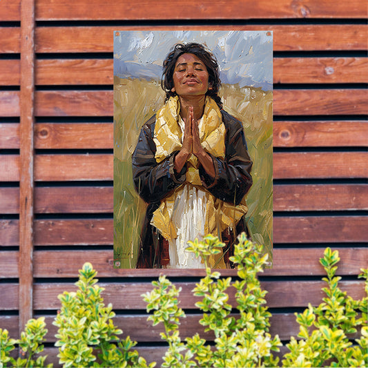 Vrouw bidt vredig in zonovergoten velden tuinposter