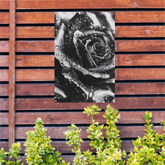 Zwart-witte roos met dauwdruppels close-up tuinposter