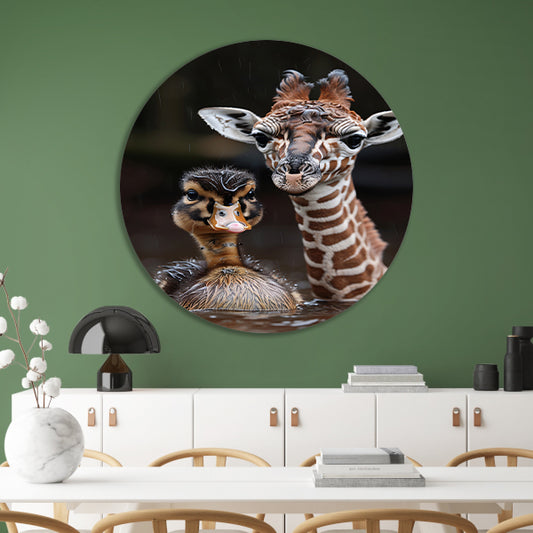 Jonge giraf en eendenkuiken in de regen aluminium muurcirkel