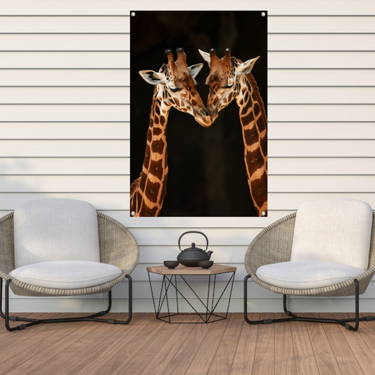 Zwart-wit kunstwerk van nuzzelende giraffen tuinposter