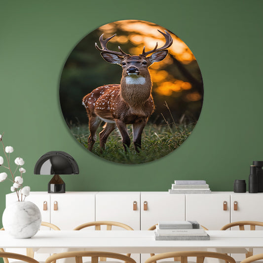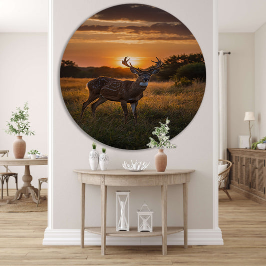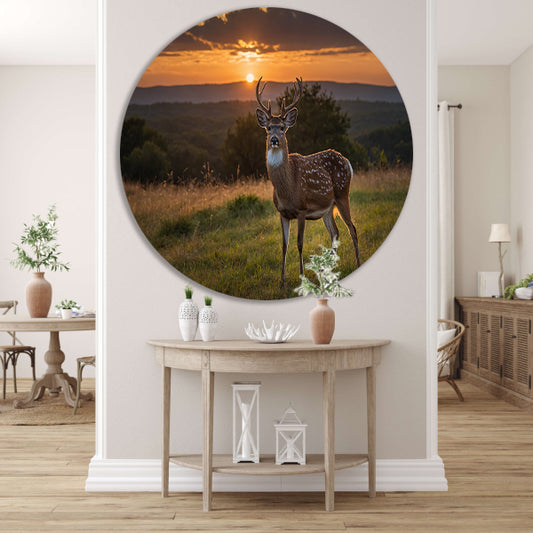 Hert in zonsondergang, natuurgetrouw en sereen aluminium muurcirkel