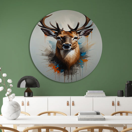 Kleurrijk abstract hert schilderij met spetters aluminium muurcirkel