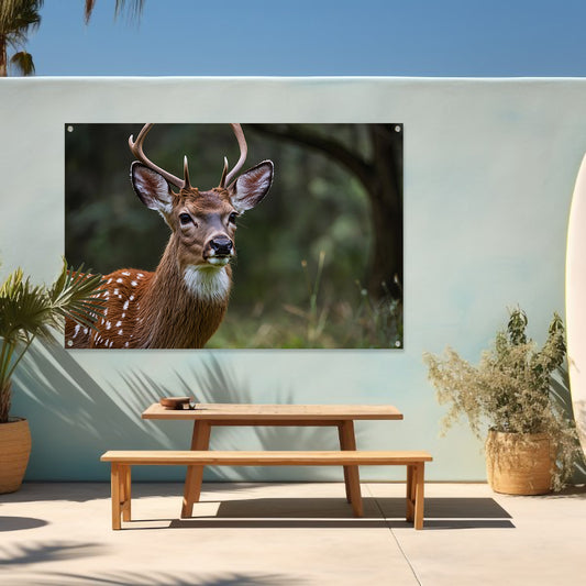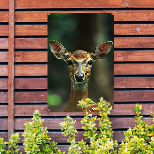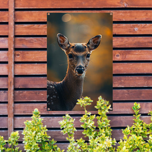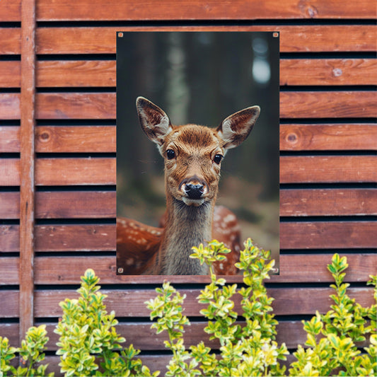 Jonge hert kijkt nieuwsgierig uit boom tuinposter