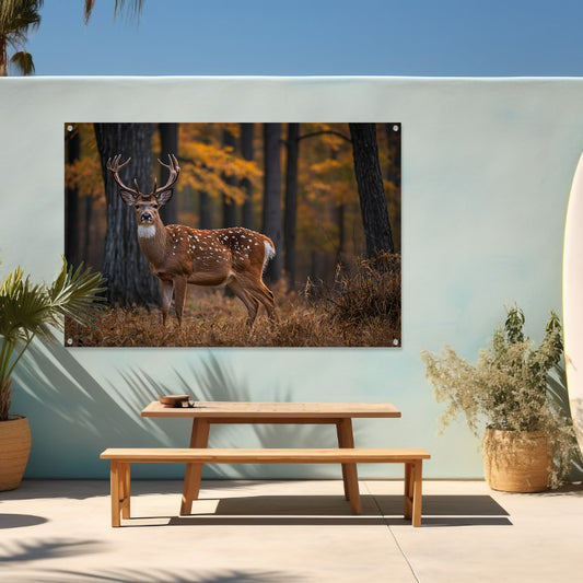 Jonge hert kijkt tussen bomen in herfstbos tuinposter