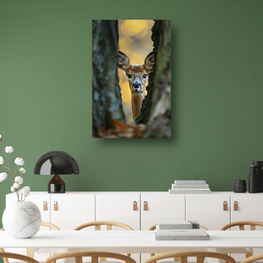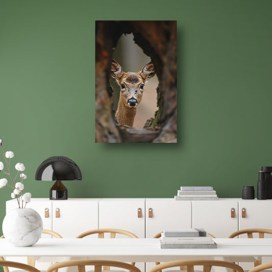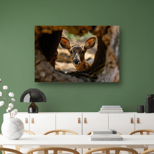 Jonge hert kijkt nieuwsgierig uit boom canvas