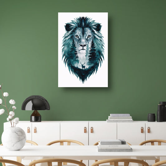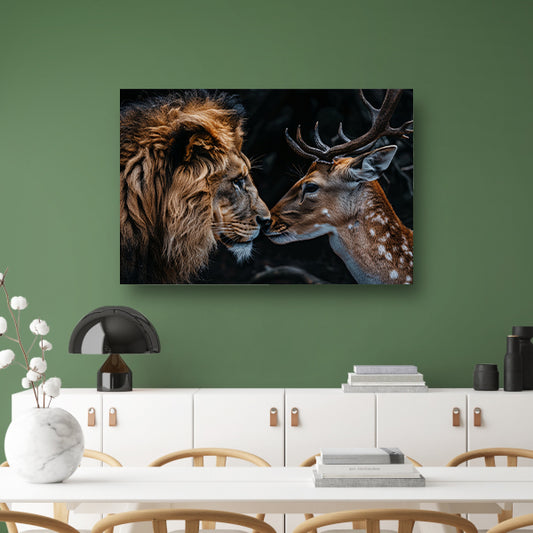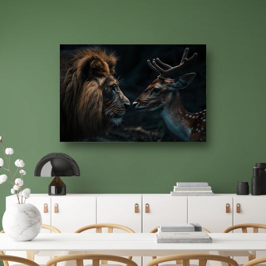 Leeuw en hert tegen donkere achtergrond acrylglas