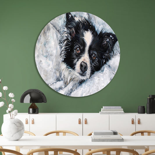 Realistisch schilderij van hond in de sneeuw aluminium muurcirkel